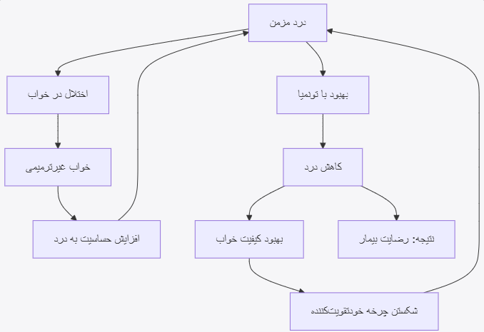 این نمودار به صورت گرافیکی نشان میدهد که چگونه درد مزمن باعث اعتراض در خواب شده و در نهایت به افزایش درد منجر میشود. با استفاده از تونمیا و بهبود کیفیت خواب، این چرخه منفی قابل شکستن است.